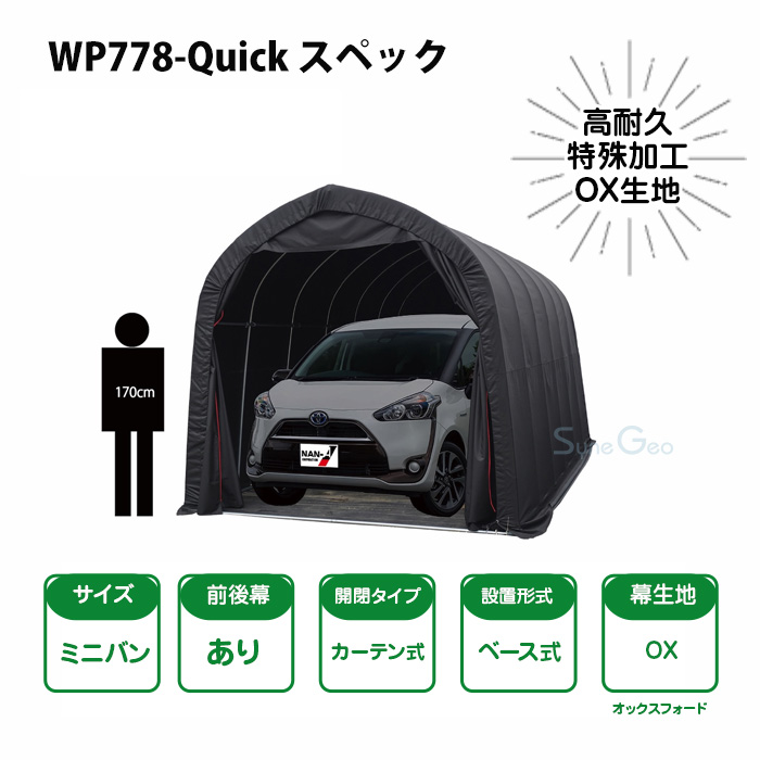 TOP 南榮工業 パイプ車庫 パイプ車庫 WP778-Quick 【組立セット】(ミニバン車・丸パイプベース式) 重量換算: 80kg 通常価格: 98,600円(税込) 販売価格: 78,200円(税込) 法人宛営業所止め個人宅宛78,200円(税込)78,200円(税込)78,200円(税込) 数量: - + カートに入れる この商品について問い合わせる ツイート 「個人宅配料」は税込価格です。 「法人宛」を選ばれた方は、 「法人名・団体名・屋号名・店名・事務所名・〇〇農園/ファーム・等」をお名前の前に必ず付けてください。 「営業所止め」を選ばれた方は、発送後に運送会社と最寄りの営業所をお知らせいたします。事前確認も可能です。お客様による運送会社の指定はできません。営業所での保管期間は約3〜4日です。「営業所止め希望」の場合は配送先を自宅とし、備考欄に「営業所止め希望」と記載してください。 「個人宅宛」を選ばれた方は、購入金額+上記個人宅配追加送料が加算されます。振込の場合は受注メールに金額変更しておりますのでお確かめいただきお振込み願います。クレジット払いの場合は一旦通常の販売価格でご購入いただき、引き落としの際に加算料金も合わせて引き落とさせていただきます。 「北海道・沖縄・離島」の方は「法人宛/営業所止め/個人宅宛」共に別途追加送料が掛かります。ご購入前に必ず見積依頼をお願いします。 ※詳しくはこちら パイプ車庫(組立セット)WP778-Quick OX生地 丸パイプベース式 カーテン式 パイプ径Φ25.4mm 丸パイプベース式でコストダウンを実現(角パイプベース式比で) 普通小型車からミニバン車までOK 丸パイプベース式で舗装面設置もOK 便利なカーテン式出入り口 ミニバンにぴったり! WP778-Quick 製品サイズ 製品スペック カーテン式入り口/特殊加工幕 丸パイプベース式 幕の耐久レベル 組立時間 ファーマーズライフでは 部品/部材の購入が可能です 梱包数 注意 寸法 全幅:2.7m × 全奥行:4.8m × 全高:2.4m 入口幅:約2.5m × 入口高:約1.9m 坪数 約3.9坪 シート オックスフォード300D ブラック色 (表:ポリエステル 裏:塩化ビニール) パイプ φ25.4mm(亜鉛メッキ鋼管)= t0.9 アーチ本数 7本 出入口 左右開き、サイドオープン/カーテン入口 パイプ車庫 WP778M 部材表・組立説明書PDF パイプ車庫 WP778M-Quick 幕シートの取り付け方PDF ご使用上のご注意 雪が積もる時は、シートを外してください。 台風や季節風などの風が強い時は、シートを外してください。 火を近づけないでください。また危険物の保管は避けてください。 夏場は庫内が高温になります。危険物や高温でのトラブルにご注意ください。 庫内での暖房や作業時の一酸化炭素中毒にご注意ください。
